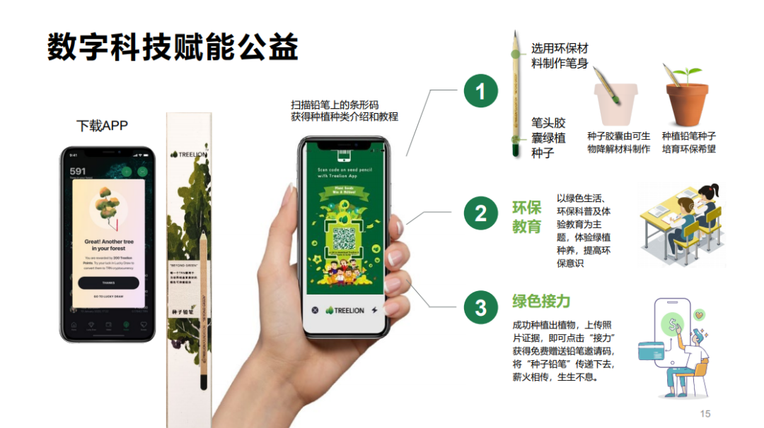 “美丽库布其·碳中和行动计划”由亿利公益基金会联合Treelion、中华环境保护基金会共同发起,通过在库布其利用植树治沙增汇、光伏治沙减排“双向碳中和”模式以及企业参与碳中和行动计划的方式,并特别将“种子铅笔”引入计划的一部分,为企业在“碳达峰碳中和”目标中贡献一份力量提供行动方案。其中“种子铅笔”由亿利公益基金会与Treelion共同开发,选用环保材料制作铅笔笔身,在铅笔顶部制作成胶囊绿植种子,当铅笔用到无法再书写时,将其倒插到花盆中进行种植。亿利公益基金会通过“种子铅笔”联动企业、员工、社会公众等多方力量,让员工通过在城市种植种子铅笔,打造种子铅笔城市种植和沙漠造林两条减碳路径,鼓励全员参与碳中和行动,为绿色经济做出贡献。