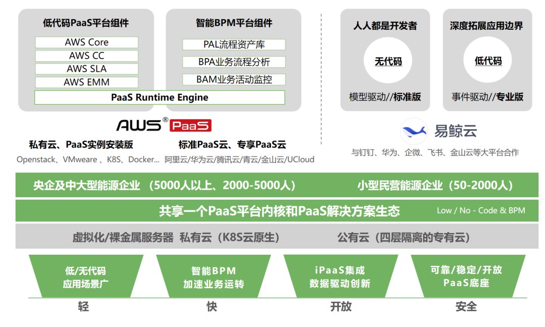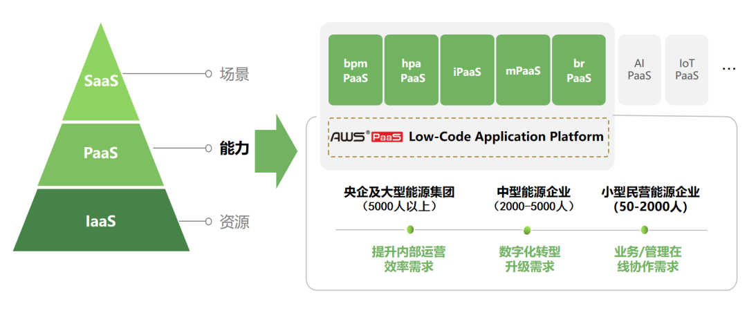 PaaS是能源企业数字化转型的技术底座,可以满足大型能源企业提升内部运营效率的需求、大型能源集团的数字化转型升级需求、中小型能源企业的业务/管理的协作需求。在Gartner公布的全球21类PaaS能力中,炎黄盈动产品涵盖智能流程、低/无代码、集成、移动、业务规则在内的PaaS能力,开放的平台与AI、IoT等专业PaaS融合,更好的适应业务及复杂的环境变化。炎黄盈动AWS PaaS长期聚焦在bpm PaaS、hpa PaaS、iPaaS等几项能力的研发与创新,通过与用户信赖的IaaS和私有云环境打通,实现弹性计算和资源动态调度。为不同规模能源企业的应用场景构建、业务集成融合以及底层架构建设方面提供技术平台支撑。