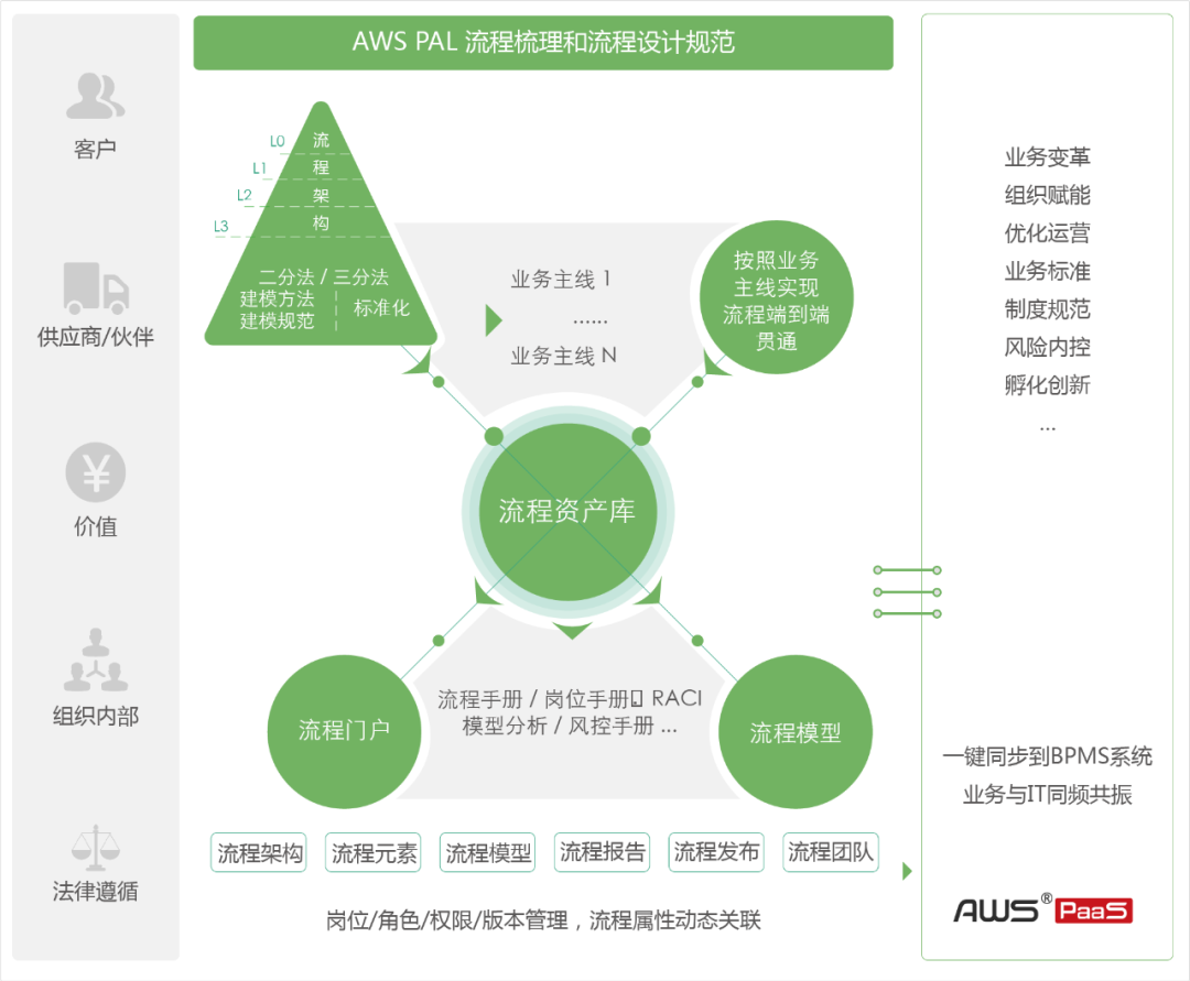 能源企业的流程管理体系已成为内部不可或缺的重要资产,从顶层战略到末端执行、从各职能到各业务域、从规划梳理到执行分析改进、从主流程到相关管理要素的融合、从管理机制到系统支撑的全生命周期管理框架,为企业战略和核心竞争力提供支撑。炎黄盈动AWS PAL提供了创建流程架构体系的向导,分清业务层次、理顺业务结构,为流程管理奠定基础。顶级的流程从价值链的角度反映组织战略,目标更直观,落地过程可溯源。